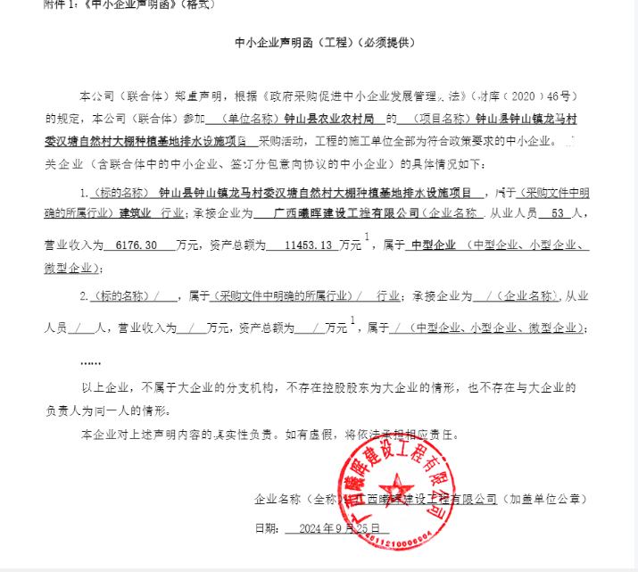 一、项目采购编号:HZZC2024-C2-220306-GXRH 二、采购项目名称:钟山县钟山镇龙马村委汉塘自然村大棚种植基地排水设施项目 三、成交信息 1.成交供应商名称:广西曦晖建设工程有限公司 2.成交供应商地址:贺州市平桂区207国道.富江东面D地块金水湾花园第8幢1单元121号商铺 3.成交总金额:(人民币:大写)玖拾伍万贰仟零柒拾陆元壹角壹分(¥952076.11) 4.要求工期:计划开工日期以开工令为准,施工总工期为90日历天。 5.质量等级:达到合格标准 6.评审得分:94.98 四、主要标的信息 1.采购项目名称:钟山县钟山镇龙马村委汉塘自然村大棚种植基地排水设施项目 2.建设规模:新建渠道总长1265m,其中1#渠长约783m,2#渠长约287m,3#渠长约57m,4#渠长约138m。渠道边墙采用390*190*190砼实心砌块,底板采用C20商品混凝土浇筑,新建7座φ1250砖砌检查井,盖板水渠约66m。具体以经评审的《工程量清单》为准,其施工技术标准详见《施工图设计》。 3.主要标的信息 项目名称 钟山县钟山镇龙马村委汉塘自然村大棚种植基地排水设施项目 成交范围 建设规模描述范围内的水利水电工程及其附属配套设施工程施工 要求工期 计划开工日期以开工令为准,施工总工期为90日历天 项目经理 梁警;《中华人民共和国二级建造师注册证书》注册编号:桂245171867385;《安全生产考核合格证书》证书编号:桂水安B20180000240 专职安全员 唐晓文《安全生产考核合格证书》证书编号:桂水安C20200000393 五、磋商小组成员名单:吴洪识、石剑征、李洋(采购人代表) 六、代理服务收费标准及金额 本次采购代理费为:(人民币:大写)玖仟伍佰贰拾元柒角陆分(¥9520.76),本项目采购代理服务费由成交供应商领取《成交通知书》前应向采购代理机构一次性全额缴纳采购代理费。计费方式按《招标代理服务收费管理暂行办法(计价格[2002]1980号)》执行(以成交价为计费基数,按差额定率累进法(100万元以下--1%,100~500万元--0.7%)计取)。 七、公告期限 自《成交结果公告》公示之日起1个工作日。供应商认为《成交结果公告》使自己的权益受到损害的,可以在《成交结果公告》期限届满之日起7个工作日内以书面形式向采购人或采购代理机构提出质疑,逾期将不再受理。 八、其他补充事宜 公示媒介:“中国政府采购网(网址:http://www.ccgp.gov.cn/)”、“广西壮族自治区政府采购网(网址:http://zfcg.gxzf.gov.cn/)”及“广西睿鸿项目管理有限公司网(网址:http://www.gxruihong.cn/)”。 九、凡对本次公告内容提出询问,请按以下方式联系 1.监督部门信息 名称(全称):钟山县政府采购监督管理办公室 地址:贺州市钟山县钟山镇兴钟中路10号 联系电话:07748989660 2.采购人信息 名称(全称):钟山县农业农村局 地址:贺州市钟山县兴钟中路49号 联系人:李工 联系电话:07748980418 3.采购代理机构信息 名称(全称):广西睿鸿项目管理有限公司 地址:贺州市八步区城东新区回建地F地块172号二、三层 联系人:冼健 电话/传真:0774-5220655 电子邮箱:gxrh5220655@163.com 4.项目联系方式 竞争性磋商供应商如对项目有质询的,应先向下述组织本项目采购活动的具体工作人员联系。 项目联系人:冼健 电话:0774-5220655 十、附件:《竞争性磋商文件》、《中小企业声明函》,详见广西壮族自治区政府采购网。 采购人:钟山县农业农村局 采购代理机构: 广西睿鸿项目管理有限公司 2024年09月25日