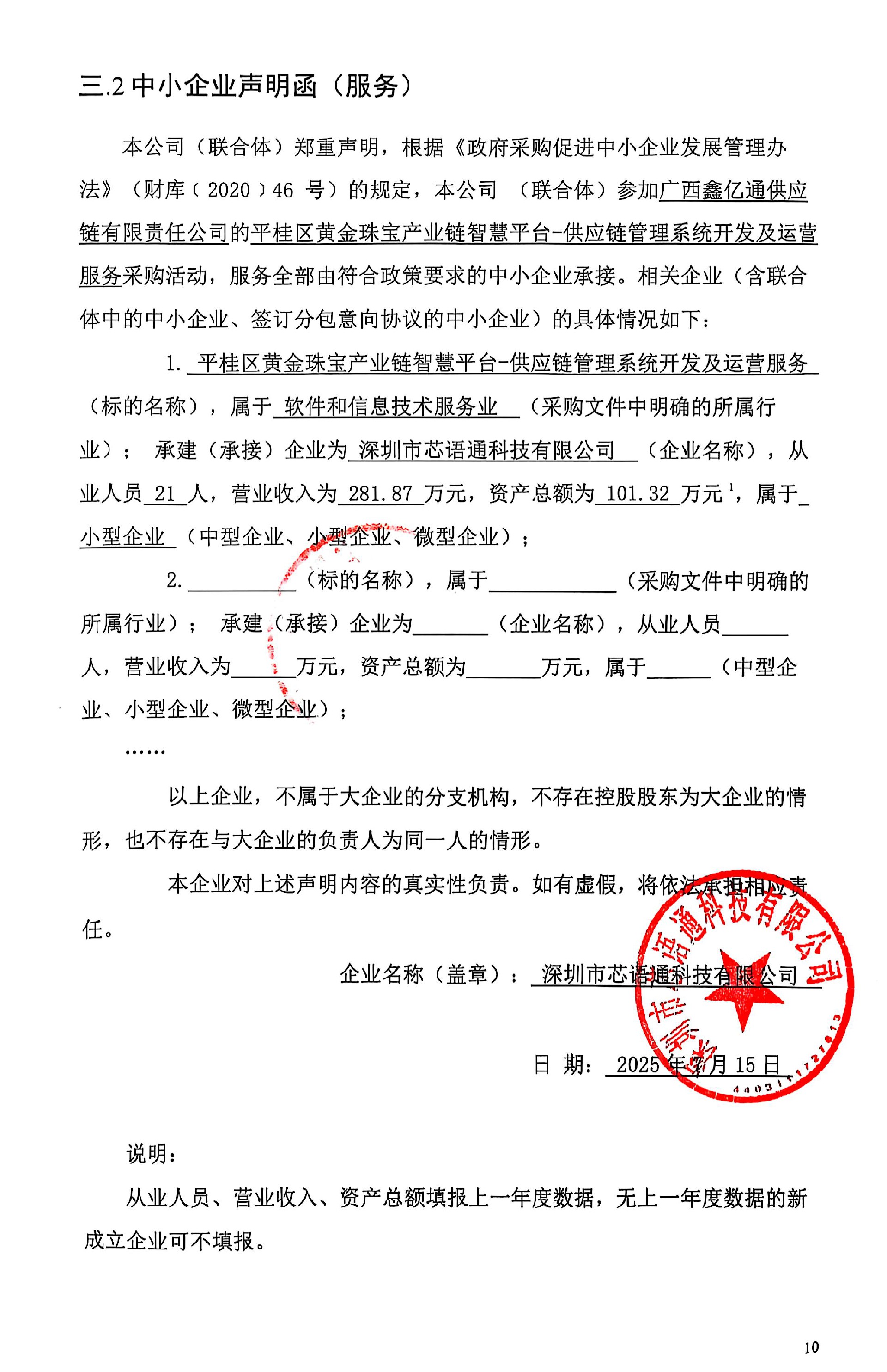 一、项目采购编号:GXRH2025F033 二、采购项目名称:平桂区黄金珠宝产业链智慧平台-供应链管理系统开发及运营服务 三、成交信息 1.成交供应商名称:深圳市芯语通科技有限公司 2.成交供应商地址:深圳市龙华区民治街道民康社区1970文化创意园A栋606 3.成交报价:(人民币:大写)贰佰玖拾叁万捌仟元整(¥2938000.00) 4.《项目合同》履行期限:系统开发期限为项目合同生效之日起6个月内;运维服务期限为系统开发完成且通过验收之日起不低于1年(含)。 质保期:验收合格之日起1年。 5.评审得分:75.50分 四、主要标的信息 1.采购项目名称:平桂区黄金珠宝产业链智慧平台-供应链管理系统开发及运营服务 2.采购范围:供应链管理系统开发及运营服务。本项目采购范围(内容(“标的”))按《中小企业划型标准规定的通知(工信部联企业〔2011〕300 号)》划定为“(十二)软件和信息技术服务业”类别。 3.采购预算价:(人民币:大写)贰佰玖拾伍万元整(¥2950000.00)。 4.《项目合同》履行期限:系统开发期限为项目合同生效之日起6个月内;运维服务期限为系统开发完成且通过验收之日起不低于1年(含)。 5.质保期:验收合格之日起1年。 6.服务要求:应响应《采购文件》第三章“项目需求和说明”载列的所有实质性内容。 7.服务标准:应包含但不限于中华人民共和国、广西壮族自治区、项目所在地设区市(县)“标的”所属行业行政管理部门(或其授权设立的行业协会(学会))颁布现行的技术规范(规程)要求。项目在实施过程中如遇相应管(归)口颁布“新标”的情形,按“新标”所在政策文件对应调整。 五、磋商小组成员名单:傅晋宏、谭健峰、郭志琼 六、代理服务收费标准及金额 本次采购代理费为:(人民币:大写)叁万零伍佰零肆元整(¥30504.00),收费标准按国家计委《招标代理服务收费管理暂行办法(计价格[2002]1980号)》执行,以成交金额为计算基数,按差额定率累进法计取,即100万元以下—1.5%;100~500万元--0.80%。由成交供应商领取《成交通知书》时一次性向采购代理机构支付。 七、公告期限 自《成交结果公告》公示之日起1个工作日。供应商认为《成交结果公告》使自己的权益受到损害的,可以在《成交结果公告》期限届满之日起7个工作日内以书面形式向采购人或采购代理机构提出质疑,逾期将不再受理。 八、其他补充事宜 公示媒介:中国采购与招标网(网址:https://www.chinabidding.cn/)、中国招标网(网址:http://www.bidchance.com/)及广西睿鸿项目管理有限公司网(网址:http://www.gxruihong.cn/)。 九、凡对本次公告内容提出询问,请按以下方式联系 1.监督部门信息 名称(全称):广西鑫亿通供应链有限责任公司行政办公室 联系电话:07748831188 2.采购人信息 名称(全称):广西鑫亿通供应链有限责任公司 地址:贺州市平桂区希望横一路与东环路交汇处西北侧(平桂区黄金珠宝产业园办公楼2# 201-219号室) 联系人:虞工 联系电话:13978459442 3.采购代理机构信息 名称:广西睿鸿项目管理有限公司 地址:贺州市八步区城东新区回建地F地块172号二、三层 邮编:542899 联系人:冼健 电话/传真:07745220655 电子邮箱:gxrh5220655@163.com 4.项目联系方式 竞争性磋商供应商如对项目有质询的,应先向下述组织本项目采购活动的具体工作人员联系。 项目联系人:冼健 联系电话:07745220655 十、附件:《中小企业声明函》 采购人:广西鑫亿通供应链有限责任公司 采购代理机构: 广西睿鸿项目管理有限公司 2025年07月16日