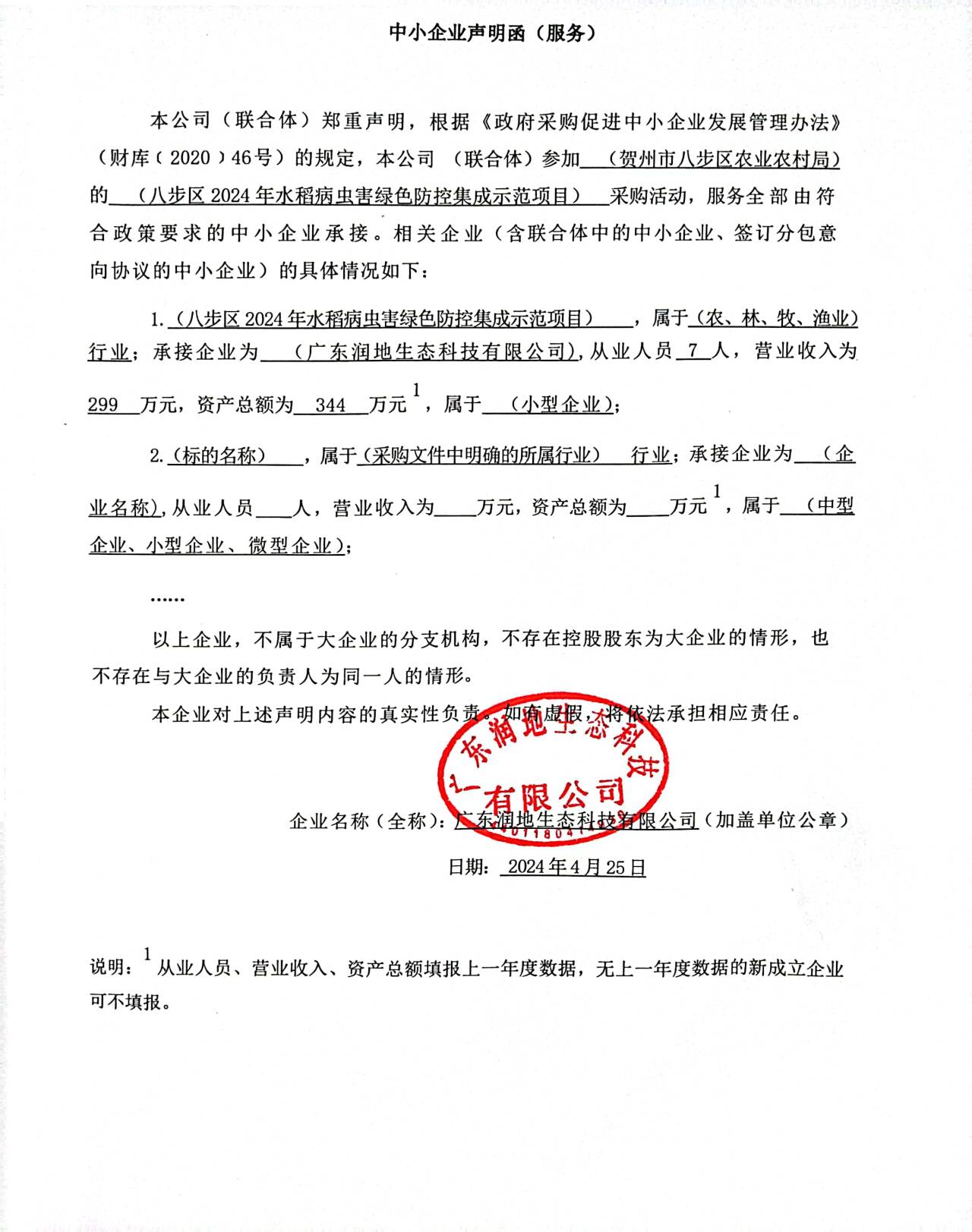 一、项目采购编号:GXRH2024F001 二、采购项目名称:八步区2024年水稻病虫害绿色防控集成示范项目 三、成交信息 1.成交供应商名称:广东润地生态科技有限公司 2.成交供应商地址:广州市天河区金颖路66号911房 3.成交总报价:(人民币:大写)肆拾柒万玖仟元整(¥479000.00) 4.《项目合同》履行期限: ◆服务期:2024年07月30日前完成本项目所有工作并经验收小组验收合格; ◆质保期:项目经验收小组验收合格之日起1年。 5.评审得分:82.979分 四、主要标的信息 1.采购项目名称:八步区2024年水稻病虫害绿色防控集成示范项目 2.采购范围:八步区2024年水稻病虫害绿色防控集成示范项目服务一项 3.采购预算价:(人民币:大写)肆拾捌万元整(¥480000.00) 4.《项目合同》履行期限: ◆服务期:2024年07月30日前完成本项目所有工作并经验收小组验收合格; ◆质保期:项目经验收小组验收合格之日起1年。 5.服务要求:响应《竞争性磋商文件》第三章“项目需求和说明”载列的所有实质性内容 6.服务标准:包含但不限于中华人民共和国、广西壮族自治区、项目所在地设区市(县)采购范围所属行业行政管理部门(或其授权设立的行业协会(学会))颁布现行的技术规范(规程)要求。项目在实施过程中如遇相应管(归)口颁布“新标”的情形,按“新标”所在政策文件对应调整 五、磋商小组成员名单:孔令平、李玉、唐定亮(采购人代表) 六、代理服务收费标准及金额 本次采购代理费为:(人民币:大写)柒仟壹佰捌拾伍元整(¥7185.00),收费标准参照执行《国家计委关于采购代理服务收费管理暂行办法(计价格〔2002〕1980号)》载明的计算方式(以成交价为计算基数,按差额定率累进法(服务类)计取,即100万元以下—1.5%),由成交供应商领取《成交通知书》时一次性向采购代理机构支付。 七、公告期限 自《成交结果公告》公示之日起1个工作日。供应商认为《成交结果公告》使自己的权益受到损害的,可以在《成交结果公告》期限届满之日起7个工作日内以书面形式向采购人或采购代理机构提出质疑,逾期将不再受理。 八、其他补充事宜 公示媒介:中国采购与招标网、中国招标网、广西睿鸿项目管理有限公司网。 九、凡对本次公告内容提出询问,请按以下方式联系 1.采购人信息 名称:贺州市八步区农业农村局 地址:贺州市八步区建设中路21号 邮编:542899 联系人:唐先生 电话:0774-5671891 2.采购代理机构信息 名称:广西睿鸿项目管理有限公司 地址:贺州市八步区城东新区回建地F地块172号二楼 邮编:542899 联系人:冼健 电话/传真:0774-5220655 电子邮箱:gxrh5220655@163.com 3.项目联系方式 竞争性磋商供应商如对项目有疑议的,应先向下述组织本项目采购活动的具体工作人员联系。 项目联系人:冼健 电话:0774-5220655 十、附件:《中小企业声明函》 采购人:贺州市八步区农业农村局 采购代理机构: 广西睿鸿项目管理有限公司 2024年04月29日